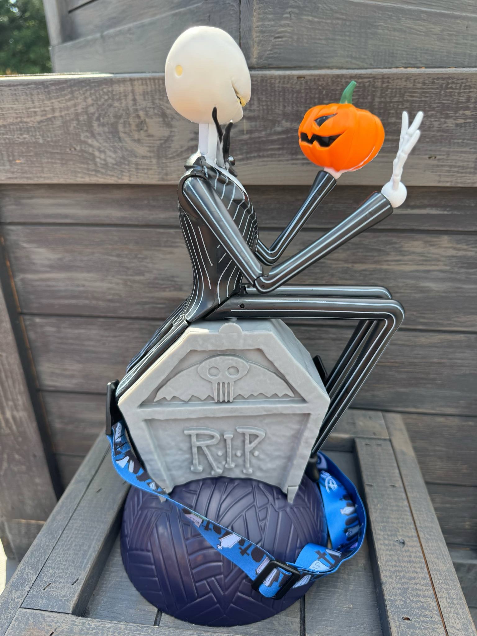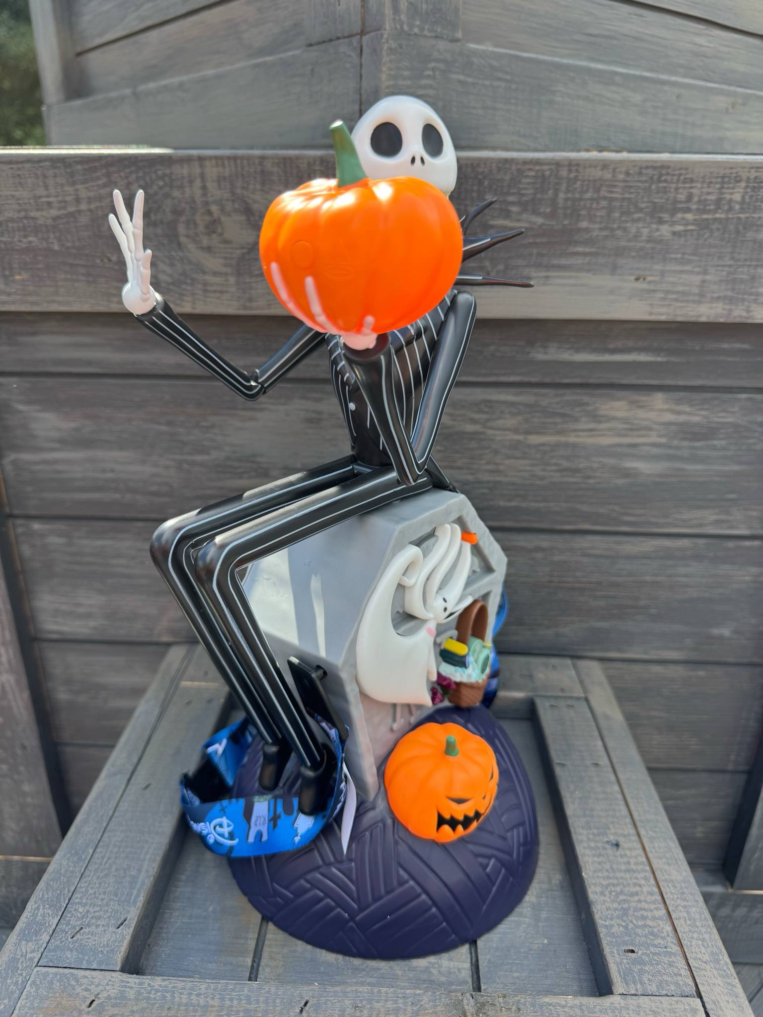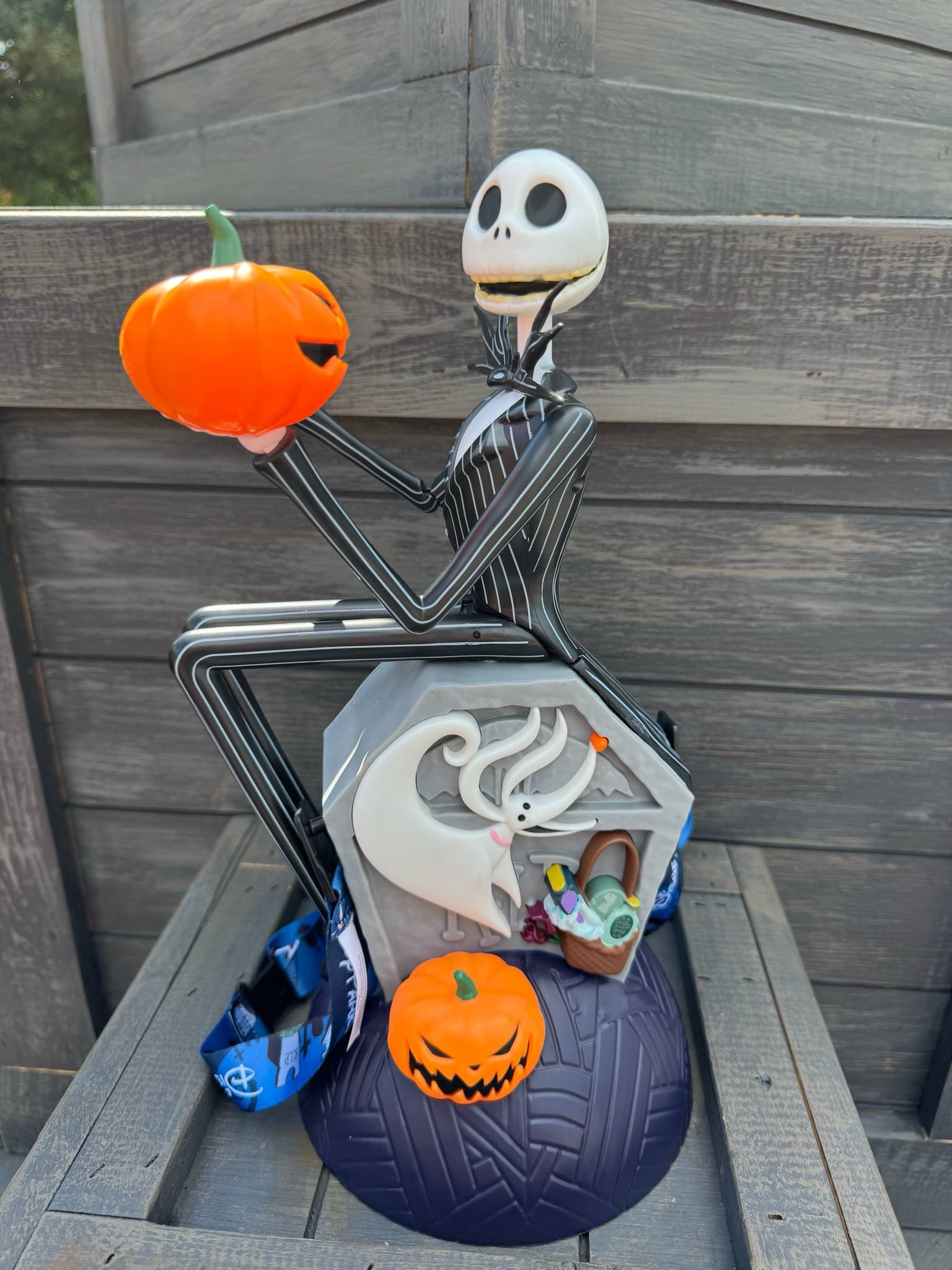 • Figura de Jack sentado sobre una lápida con Zero y calabazas.