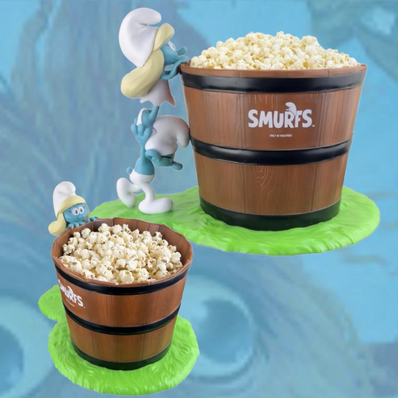 El detalle más adorable: Pitufina animando junto al barril de palomitas.